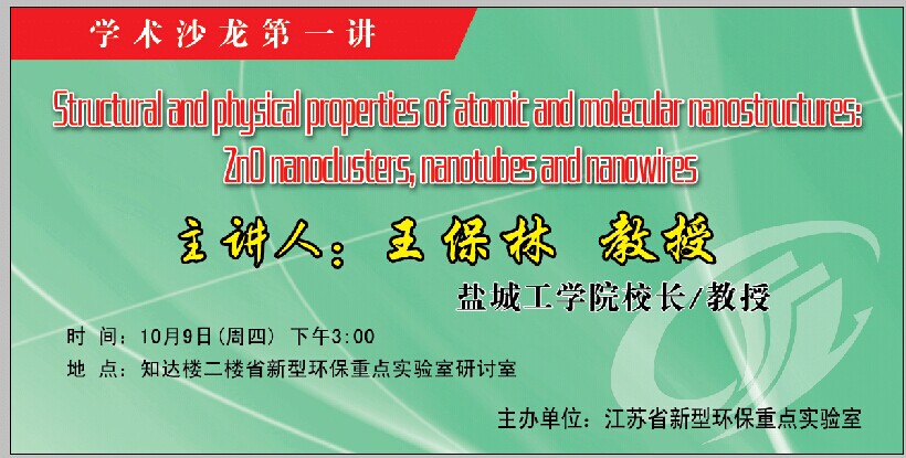 2014109日下午3:00,江苏省新型环保重点实验室于知达楼二楼研讨室成功举办了第一场学术沙龙交流会。此次沙龙的主讲人王保林教授是盐城工学院校长,江苏省新型环保重点实验室主任、教授、博士生导师,主要从事低维纳米系统的结构和性质的研究工作。此次讲座的题目是《Structural and physical properties of atomic and molecular nanostructures: ZnO nanoclusters, nanotubes and nanowires》,参加学术交流的有省新型环保重点实验室、材料工程学院、化学与生物工程学院、环境学院部分教师和研究生50多人。