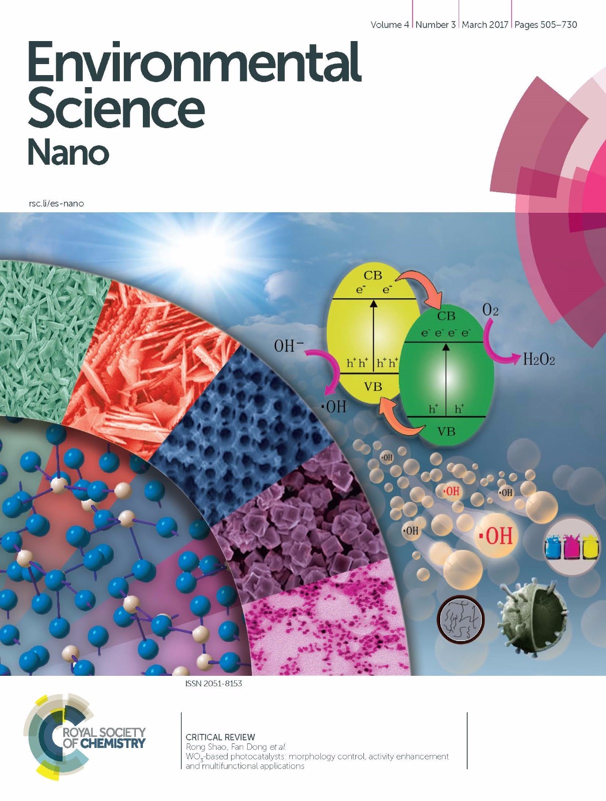 《Environmental Science: Nano》杂志是英国皇家化学旗下的学术期刊,主要报道纳米材料在环境领域的应用及其相互作用。该杂志2016年影响因子为5.896,为SCI一区Top期刊。SCI期刊封面论文是主编和编委会依据严格的学术和审美原则选出来的。所遴选出来的论文都具有一定标志性,体现了编辑部和同行专家对论文工作的高度认可,以及对论文作者和所在科研院校单位学术研究能力的充分肯定。论文作为封面文章发表是一种很高的荣誉,在科学界备受重视。