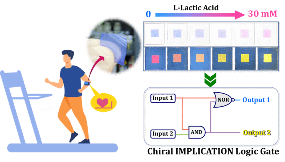 该论文基于可食用环糊精类手性MOFs,设计开发了一种具有多重变色功能的手性传感材料,对人体生理代谢产物L-乳酸实现双通道变色手性识别。进一步以PES为基质,构建了一种柔性、可穿戴手性变色薄膜材料,通过颜色、荧光发射等信号变化,建立了一种新颖的手性IMPLICATION型逻辑计算单元,通过可见光、荧光等双通道信号变化实时监控反馈机体运动状态。该成果首次实现了对手性乳酸分子的多重可视化定量识别,代表了首例MOFs可穿戴手性逻辑门,建立了一种基于可穿戴逻辑门的运动健康监测新技术方案。该论文的研究成果系统展示了基于MOFs精准设计的手性可穿戴逻辑门设计策略及方法,对于可穿戴智能健康技术及分子计算机研发具有重要意义。